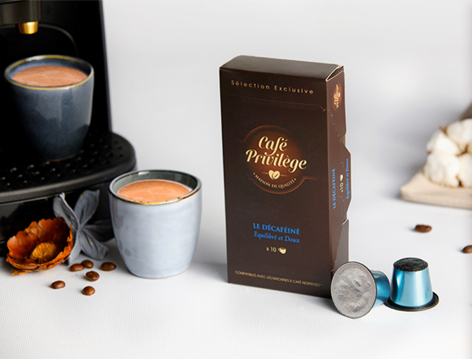 Le Décaféiné en capsules compatibles Nespresso®* est un café équilibré et doux, conservant toutes les qualités gustatives d’un café d’exception. Grâce à ses arômes riches et son caractère tempéré, le Décaféiné en capsules vous offrira de grands moments de dégustation.